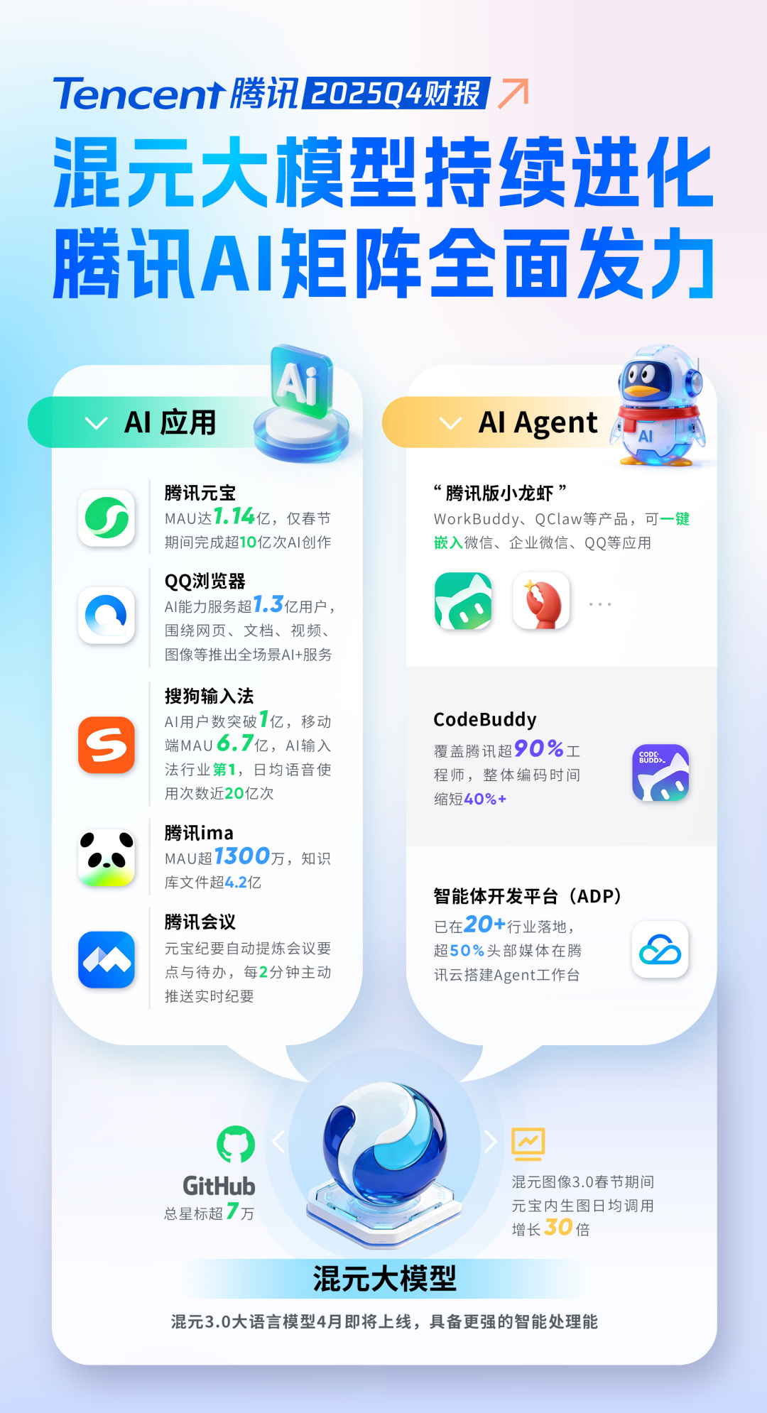 过去一年,腾讯AI战略全面提速,从单点尝试转向系统覆盖,助推核心业务韧性增长。同时,大力投入基础模型、AI产品及人才引进。