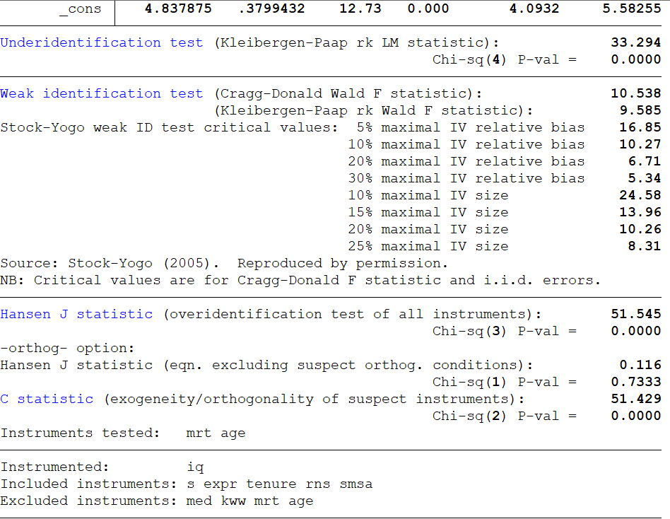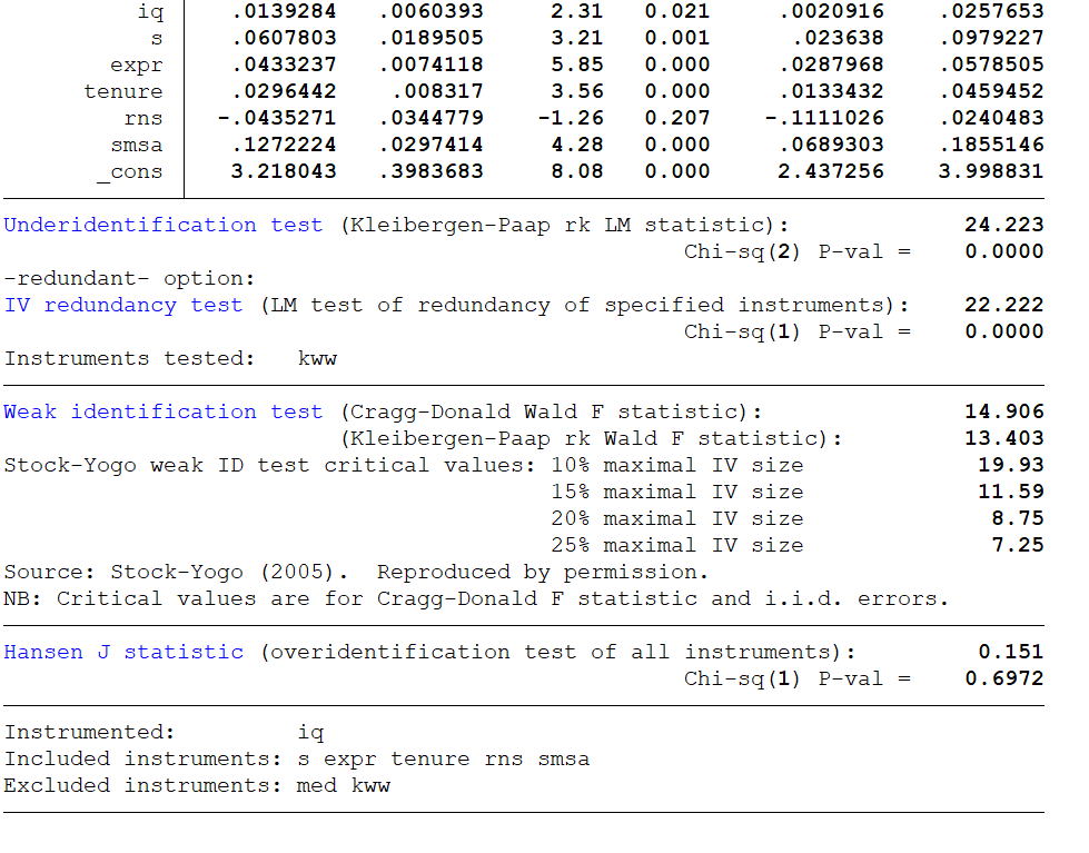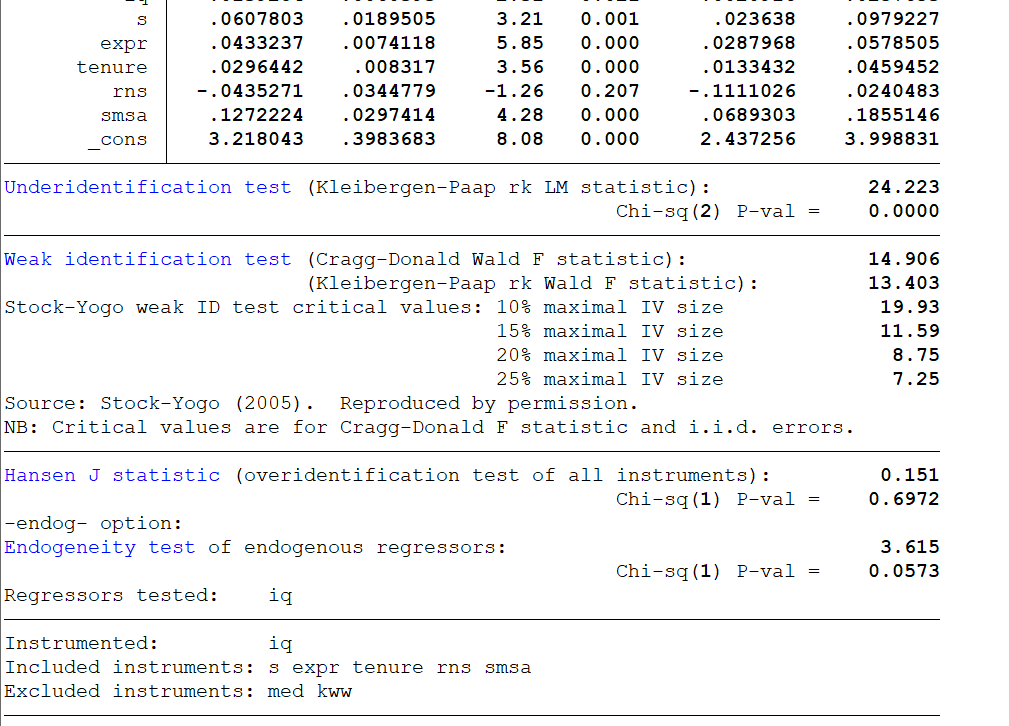 qui ivregress 2sls lw s expr tenure rns smsa (iq=med kww )