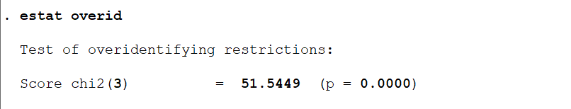 在Underidentification 和IV redundancy 两个test中,p值均接近于0,表明强烈拒绝该变量为冗余变量的假设。