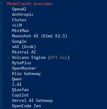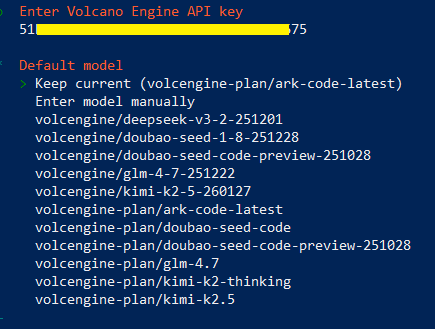 下一步选模型,如果没有特殊需求就用他家的 ark-code-latest 模型。之前还支持 GLM-5 的,最近下线了。