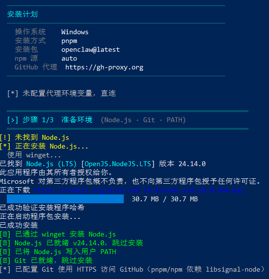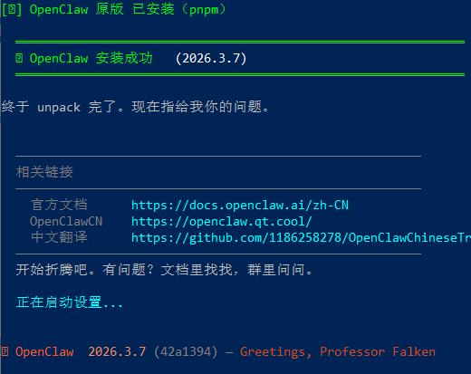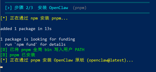 然后脚本会通过 pnpm 安装原版 openclaw
