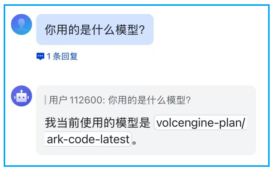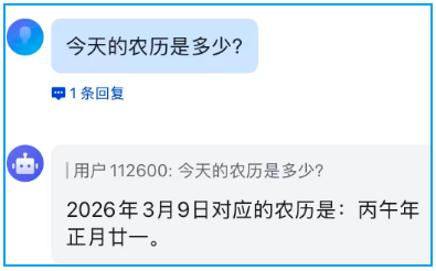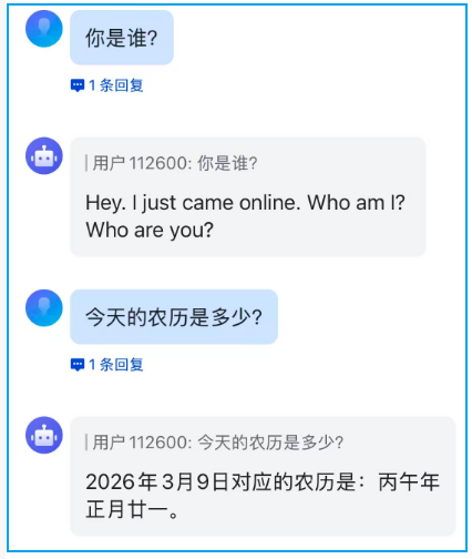 执行完命令,飞书就对接完了,测试一下问它今天几号: