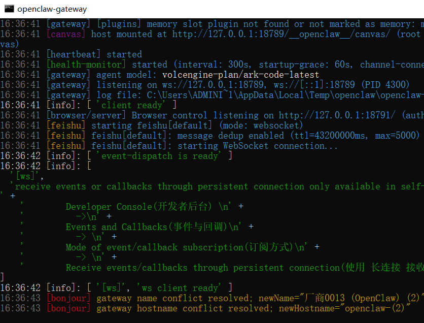 配完飞书插件会自动重启 openclaw 的 gateway,如果配置成功,输出如下:
