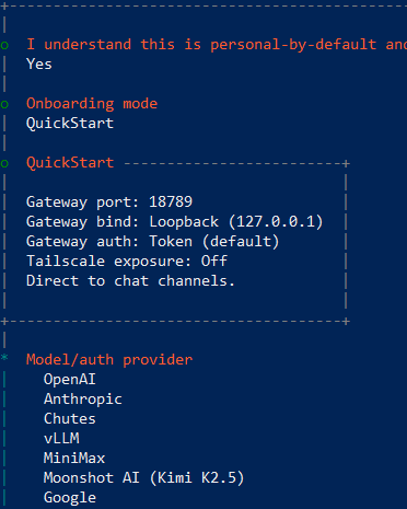 openclaw 安装完会有一个提示,开始启动配置环节:
