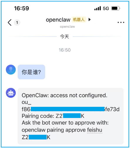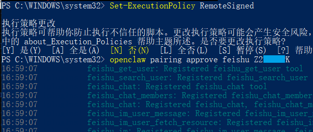 这条消息的意思是要在后台配对 approve 一下飞书的应用,命令如下: