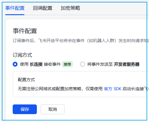 后面需要在飞书上配置飞书的长连接接收事件和卡片回调,这部分参考飞书文档:
