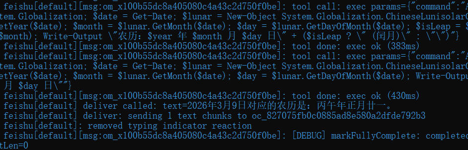 在后台可以看到 openclaw 自己调用 powershell 命令完成了公历到农历的转换,说明 openclaw 的确是有工具调用能力的。
