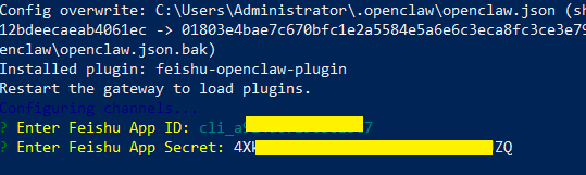 重装飞书插件后会提示输入飞书的 App ID 和 App Secret,这个要在飞书上创建(见飞书文档)。