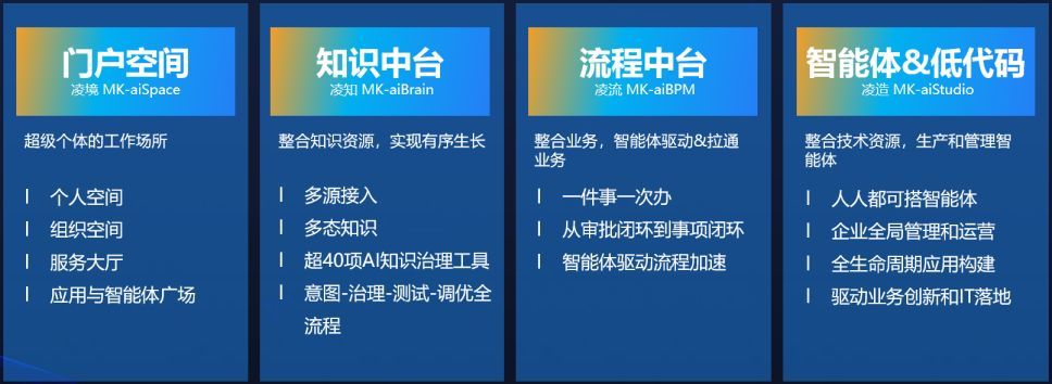 依托MK数智原力基座与智能业务中台,蓝凌全面升级新一代aiOA、aiKM、ai业务应用等,全方位赋能企业AI数智转型:aiOA,支持全栈信创、全球化、智能体;aiBPM构建企业流程大脑、企业办事大厅,助力核心业务变革;aiKM智能知识管理平台,集“内容管理、知识湖仓、知识智能、知识空间”四维进化于一体;ai业务应用,覆盖“研产销服人财物事”多场景全流程AI数智化。