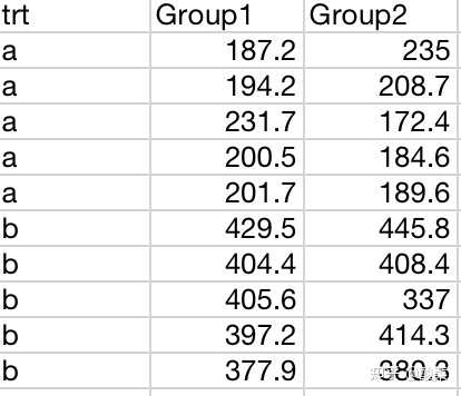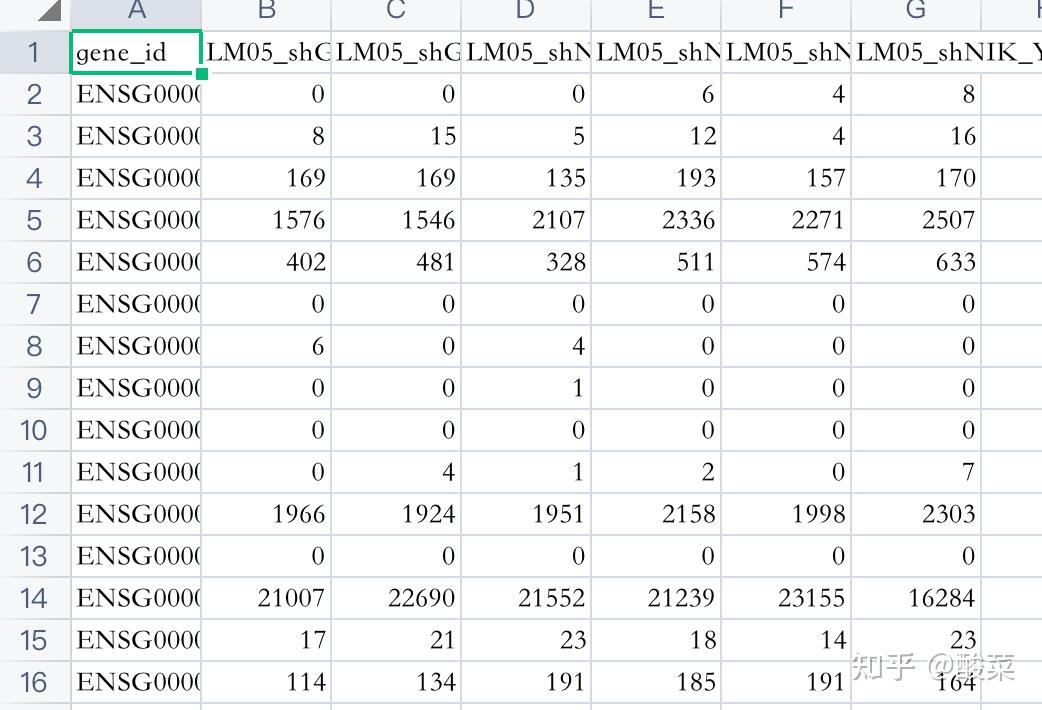 当对应的数据集含有 原始的counts值(没有进行过转化)的文件时(比如上图),可以下载对应的数据并进行整理(如果不在一个表格,把所有数据放到一个表格中,并在第一行增加分组信息(差异分析比较的两个组)):(数据集的分组数据可以看“如何找到自己需要的数据”这部分的内容中的样本信息部分)