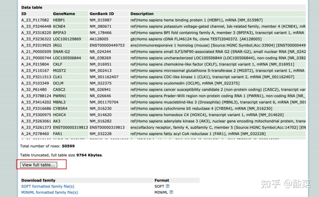 点击Full table下载 探针-分子 对应文件(如果是网页打开,可以在网页右键保存为txt,再用excel打开)。(注意:不是所有的平台都有具体的分子,有一些平台注释不全的,有可能找不到有注释分子名的,这种平台就不建议使用了)
