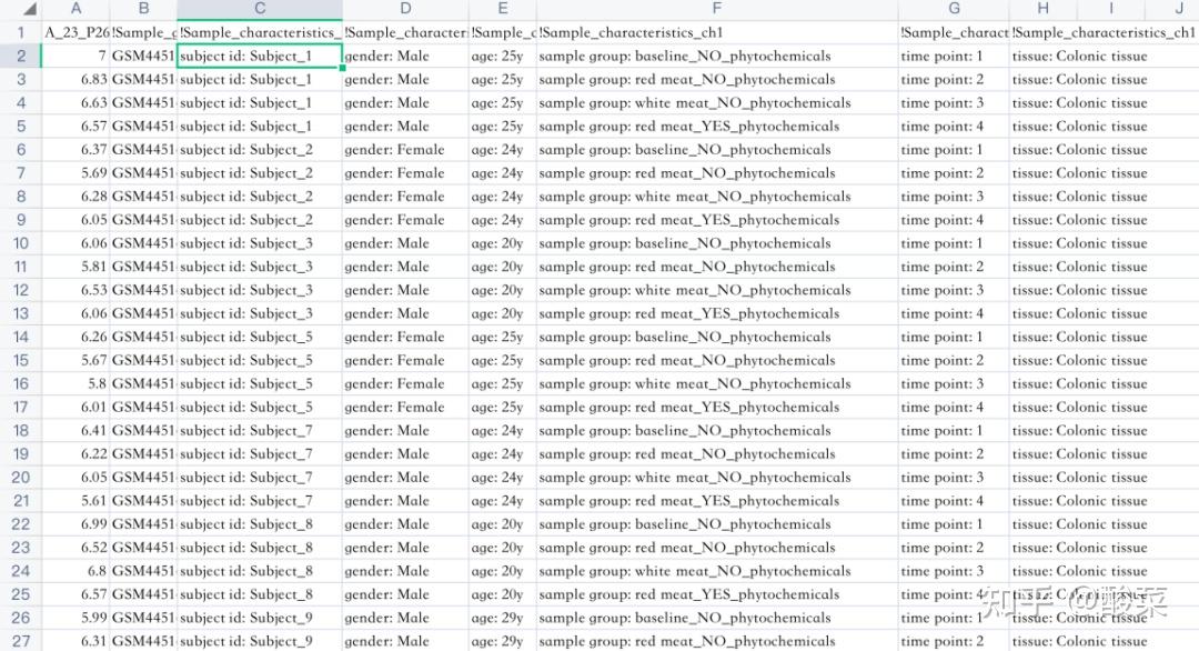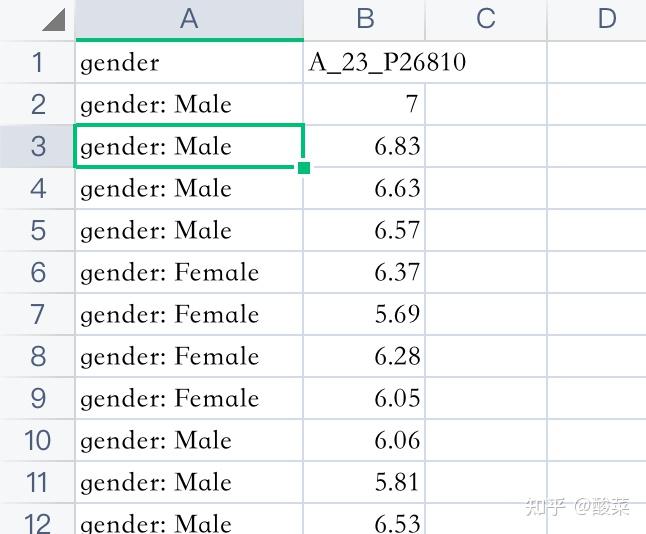 在下载的数据中搜索分子,提取需要的数据成两列(或者多列)(类似下图):(数据集的分组数据可以看“如何找到自己需要的数据”这部分的内容中的样本信息部分)