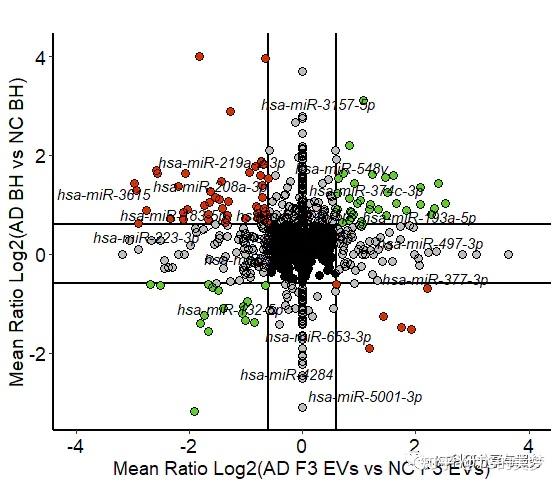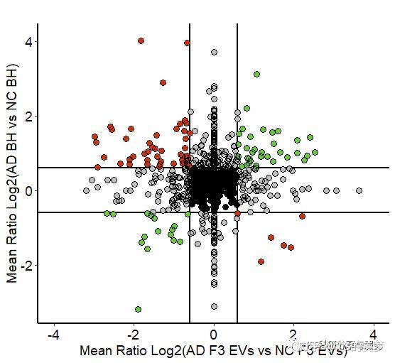 ggplot(A, aes(x=MeanRatio_X, y=MeanRatio_Y)) + geom_hline(yintercept= c(-0.6, 0.6), color = “black”, size=1) + geom_vline(xintercept=c(-0.6, 0.6), color = “black”, size=1)+ geom_point(size=3)+ geom_point(data = A[A\(MeanRatio_X>0.6 | A\)MeanRatio_X < -0.6, ], size=3, shape=16, color=“grey”)+ geom_point(data = A[A\(MeanRatio_Y>0.6 | A\)MeanRatio_Y < -0.6, ], size=3, shape=16, color=“grey”)+ geom_point(data = A[A\(MeanRatio_X>0.6 & A\)MeanRatio_Y>0.6, ], size=3, shape=16, color=“#66CC33”)+ geom_point(data = A[A\(MeanRatio_X< -0.6 & A\)MeanRatio_Y< -0.6, ], size=3, shape=16, color=“#66CC33”)+ geom_point(data = A[A\(MeanRatio_X< -0.6 & A\)MeanRatio_Y > 0.6, ], size=3, shape=16, color=“#CC3300”)+ geom_point(data = A[A\(MeanRatio_X > 0.6 & A\)MeanRatio_Y < -0.6, ], size=3, shape=16, color=“#CC3300”)+ geom_point(size = 3,shape=21)+ xlim(-4,4)+ ylim(-3.2, 4.1)+ labs(x = “Mean Ratio Log2(AD F3 EVs vs NC F3 EVs)”,