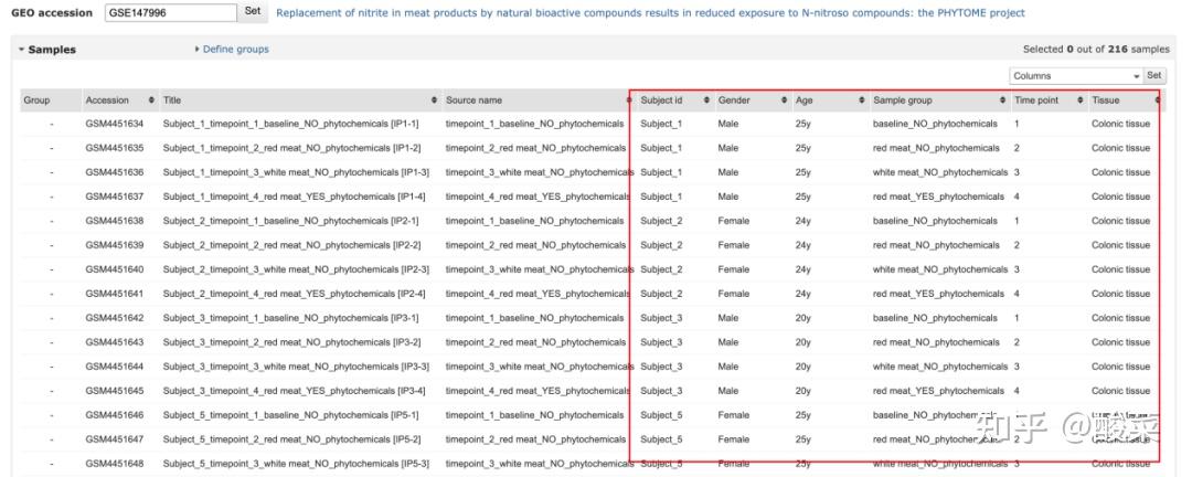 点击进入到GEO2R,等待数据加载好后,能看到每个样本的补充信息(这部分信息和第一种方式看到的内容基本是一致的,通过GEO2R就不用点开每个样本来查看)