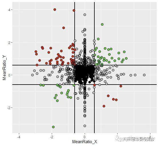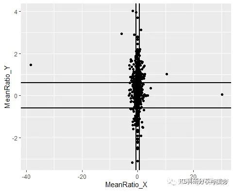 library(ggplot2) library(ggrepel) ggplot(A, aes(x=MeanRatio_X, y=MeanRatio_Y)) + geom_hline(yintercept= c(-0.6, 0.6), color = “black”, size=1) +#添加横线 geom_vline(xintercept=c(-0.6, 0.6), color = “black”, size=1)+ geom_point()