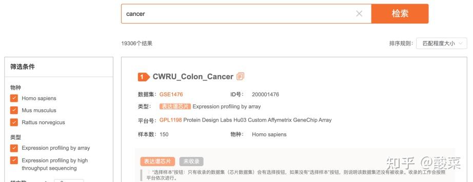 建议右侧限定Series(保证出来的是GSE,不含有GSM(可以不用看GSM))和平台类型(芯片或者RNAseq或者其他)备注:通过GEO数据库搜出来的内容肯定是最全的,任何通过别的数据库或者别的方式搜出来的内容肯定不是最全的。