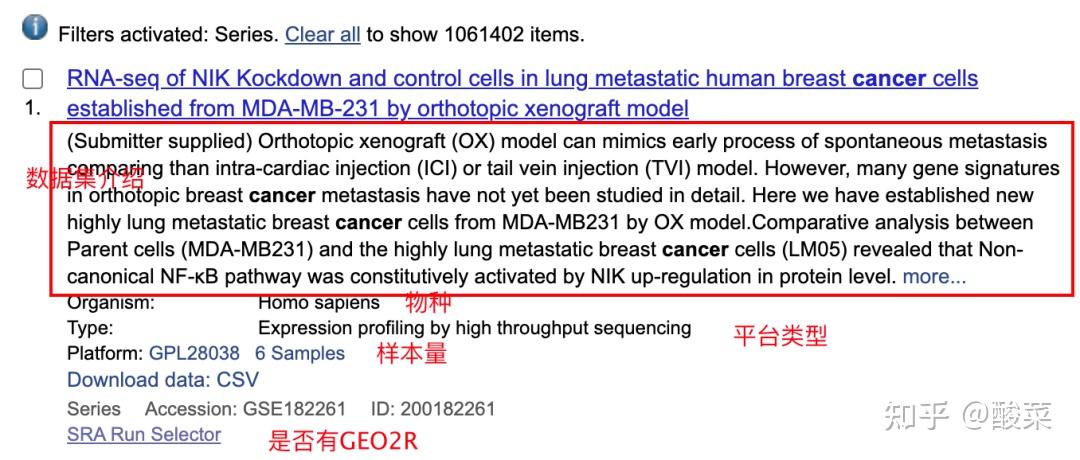1. 通过在GEO数据库直接检索(类似pubmed的检索) 重点需要看 数据集中每个样本带有的信息: