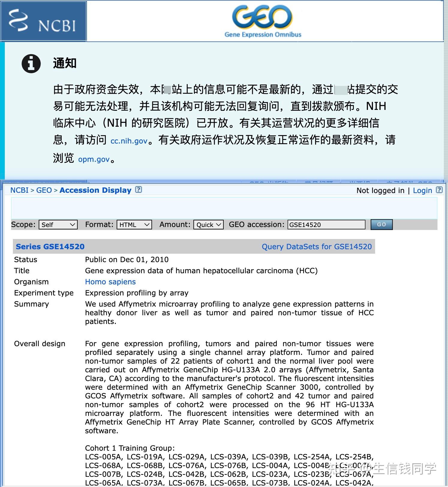 天塌了,GEO的生信数据其实开源性做的非常好,基本上数据都能下载,很多纯生信的文章都是靠挖的这个数据。现在进入任意一个数据中都能看到这个通知,不再更新了,看看未来 到了,还能不能恢复;