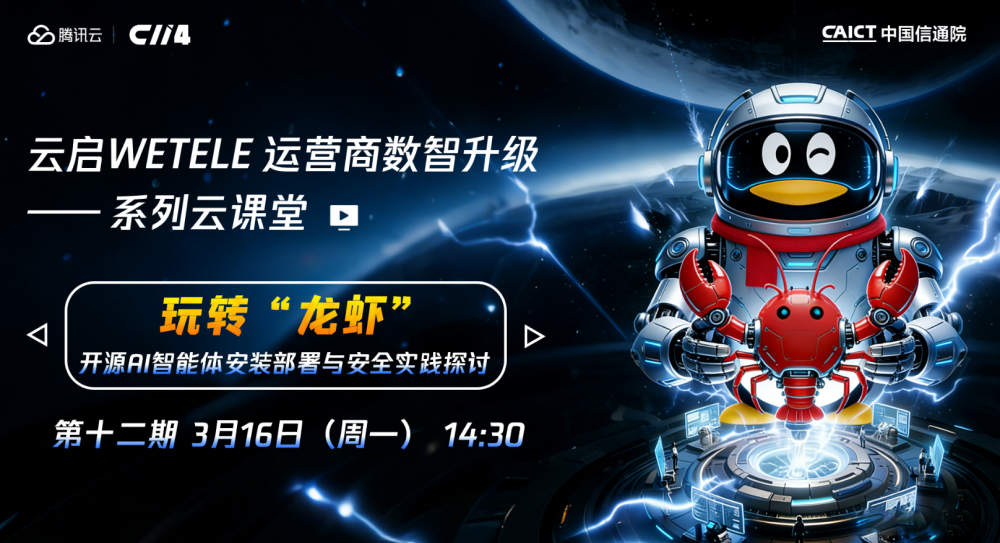 C114讯 3月16日,由腾讯云携手中国信息通信研究院云计算与数字化研究所、C114通信网打造的“云启WETELE运营商数智升级”系列在线课堂,2026年第一期(总第十二期)正式开讲。本期课堂的主题是探讨当前最火热的AI智能体OpenClaw(昵称“龙虾”)。
