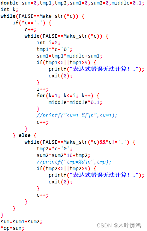 - 整数部分,读到一个数*10存到num2中再读取一个数字num2*10加当前数字,循环直到读到小数点和操作符结束。