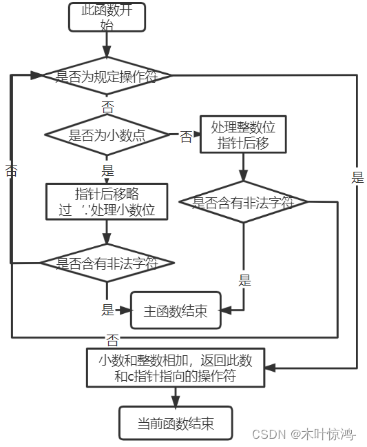 乘以当前数字,循环直到读到操作符结束。 - 在对当前数字进行操作时遇到非法字符则报告错误且结束整个函数。