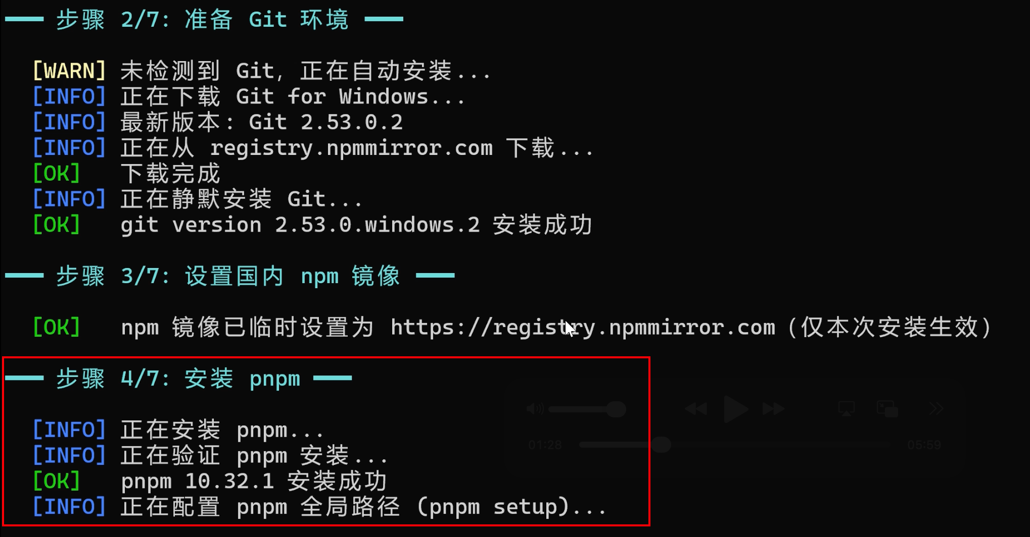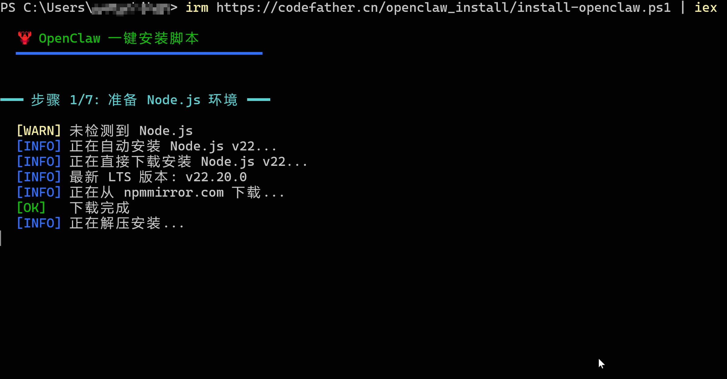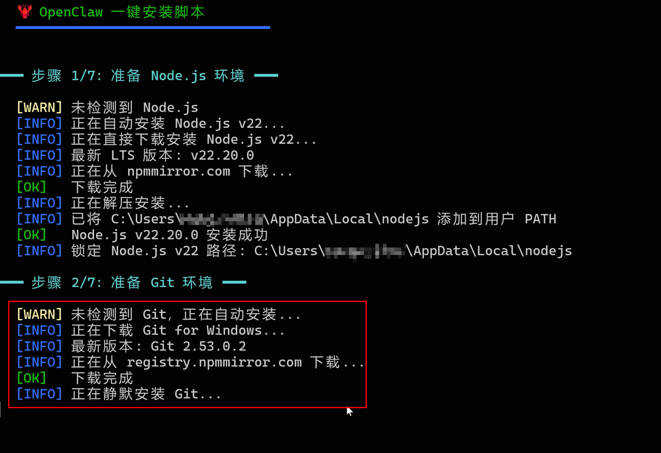 1)检测并安装 Node.js v22+,支持 nvm-windows 或 直接下载,而且会通过国内镜像加速: