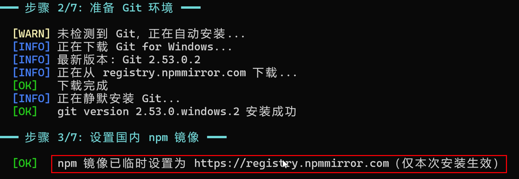 2)npm 镜像、Node.js 下载源、Git 下载源全部走国内镜像,下载速度嘎嘎快
