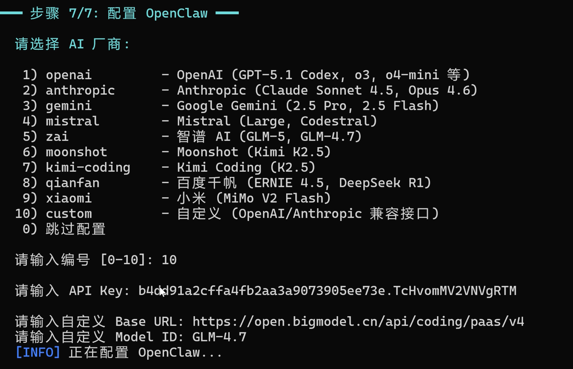 7)交互式配置,脚本会引导选择 AI 厂商、输入 API Key、选择默认模型,一步搞定: