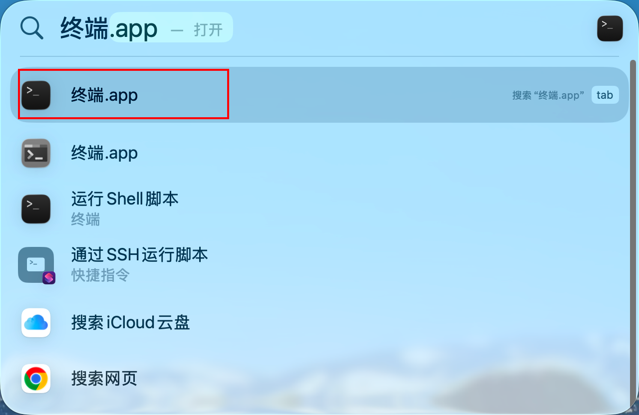 按 Command + 空格,唤起聚焦搜索,搜索「终端」,点击打开: