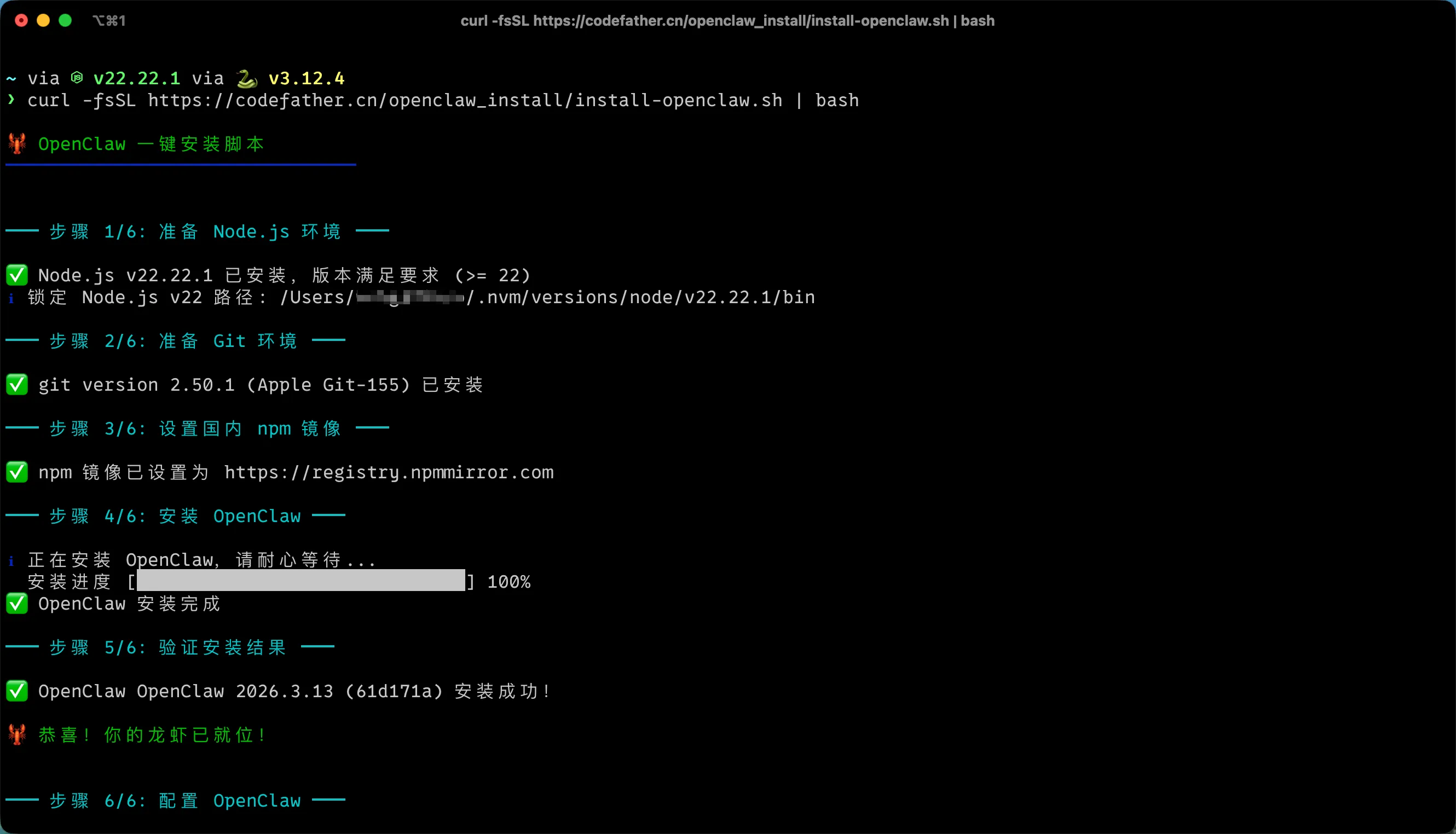 - 检测并安装 Node.js v22+,脚本会依次尝试 nvm → Homebrew → 直接下载 方式来安装
