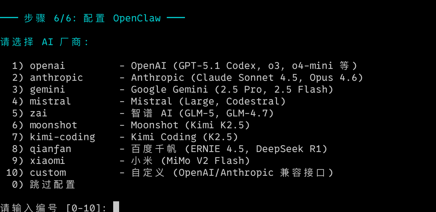 4)支持 OpenAI、Anthropic、Gemini、智谱、Moonshot、Kimi Coding、百度千帆、小米等多家 AI 厂商,选完即用: