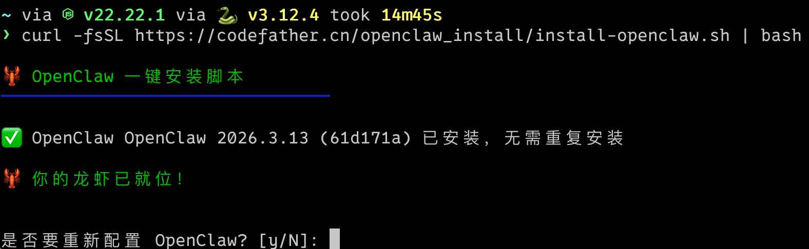 其实这个脚本并不复杂,大家借助 AI 都能梭出来。如果之后面试官问你 “怎么安装小龙虾?”,不要直接说 “复制官方提供的命令” 了,改为 “自己封装了个一键脚本” 才是更符合技术人的做法。