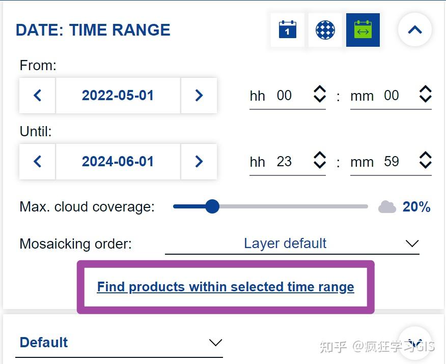 此外有一点需要注意:如果需要下载某个时间范围内的所有Sentinel-2数据产品,那么需要选择“TIME RANGE”中最下面一行小字,如下图所示。