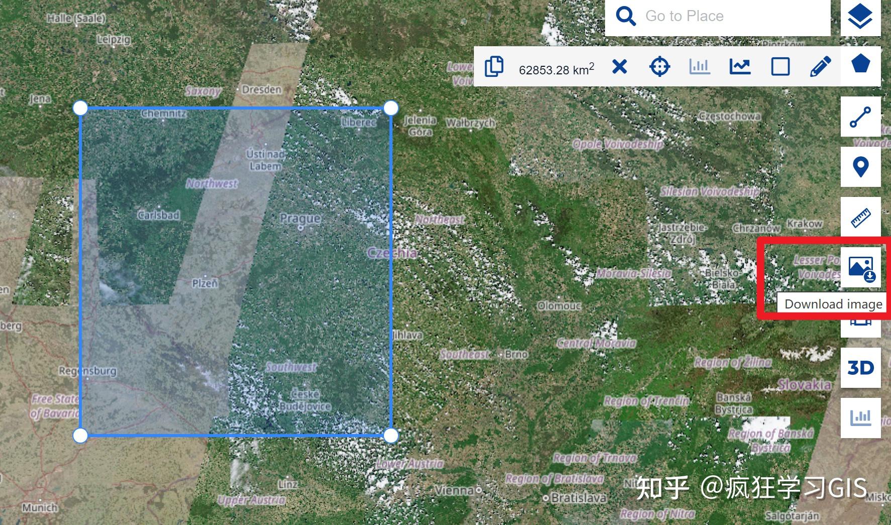 随后,到地图中缩放一下地图,就会出现图像结果。结果出现后,可以通过右侧的“Download image”图标,将我们需要的遥感影像进行下载。