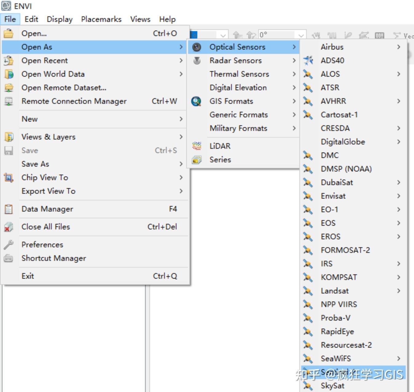 其中,这一数据在ENVI中应该是没有办法直接打开的;如下图所示,通过“Open As”方式并不能成功将其打开(最近网站改版后,下载得到的数据是否可以这样打开我没有尝试,大家可以再试试看)。