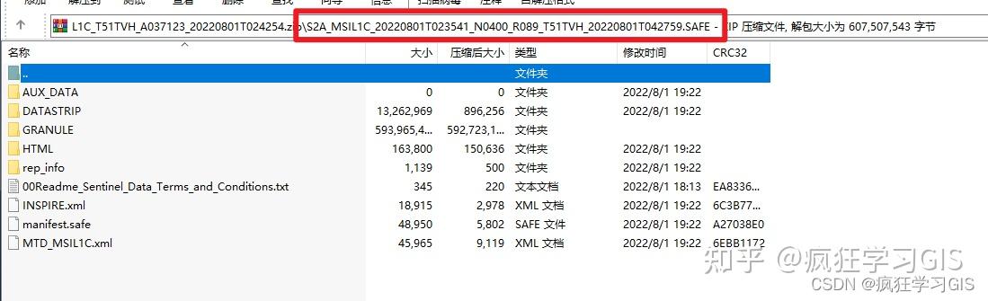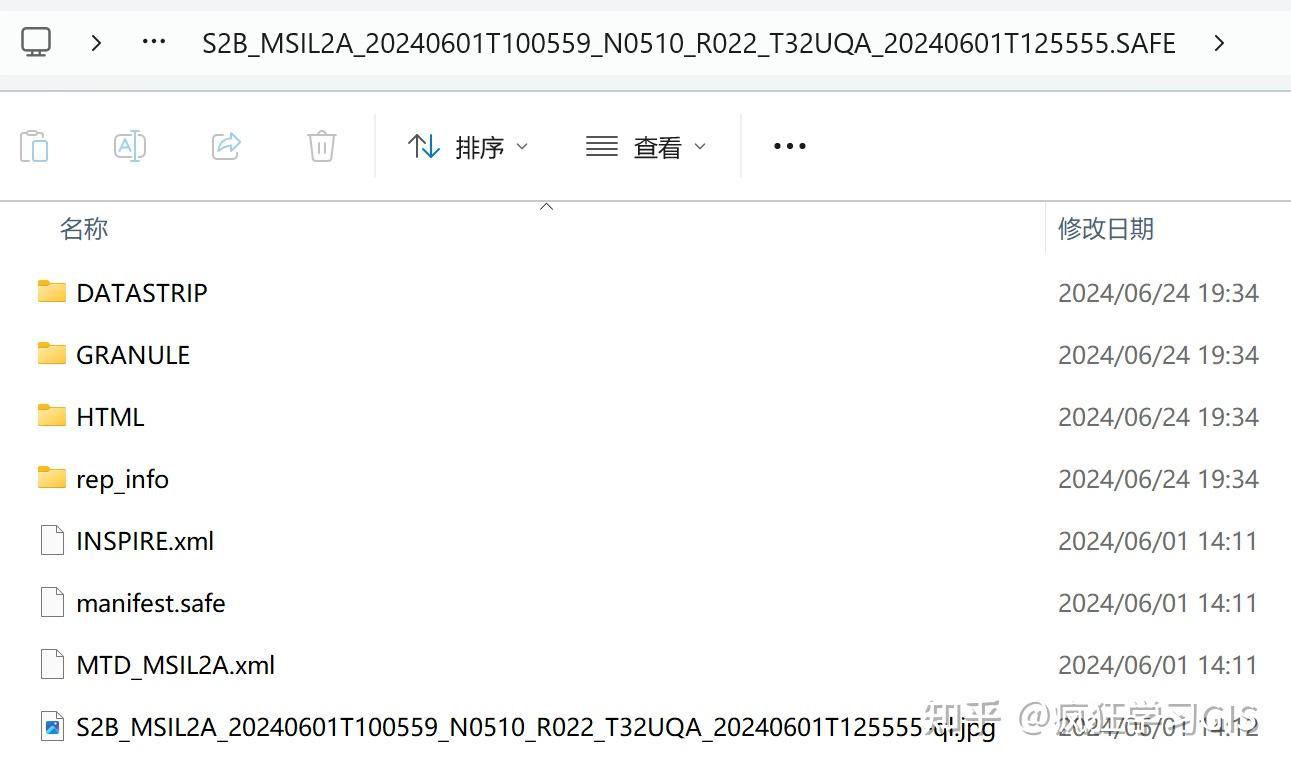 L2A级遥感影像产品下载后,如果大家选择的是完整一景图像,那么得到的就是一个.zip格式的压缩包;将压缩包解压后得到如下文件。