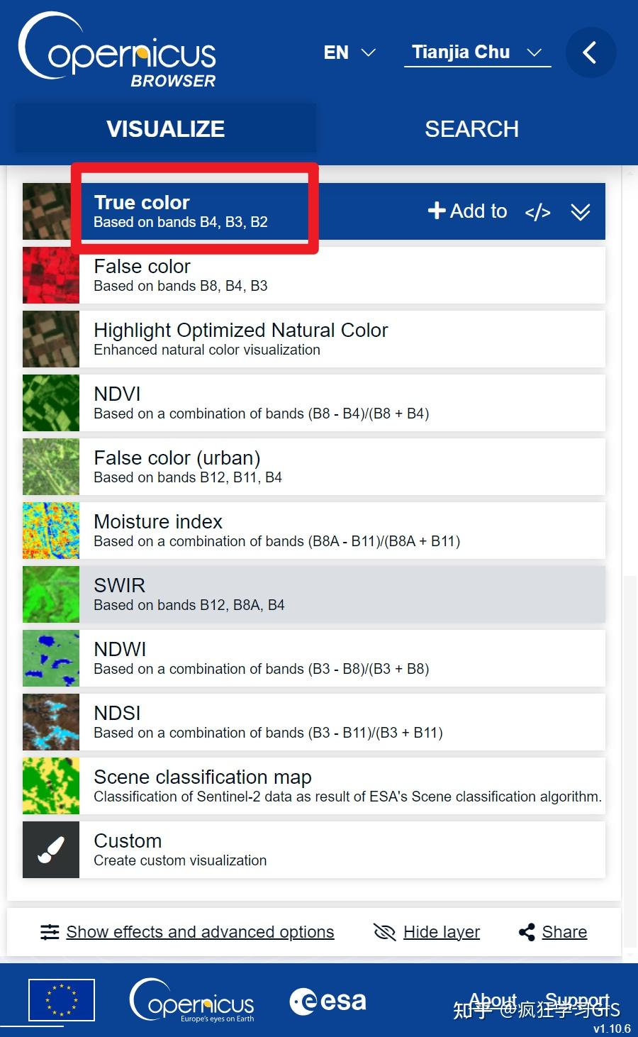 如果不需要下载时间范围内的大量图像,那么按照需求,选择筛选遥感影像时所用可视化的图像类型。一般情况下,我们就用真彩色合成来筛选图片,所以点击“True color”一栏中右侧的“Add to”按钮,即可搜索符合要求的遥感影像。