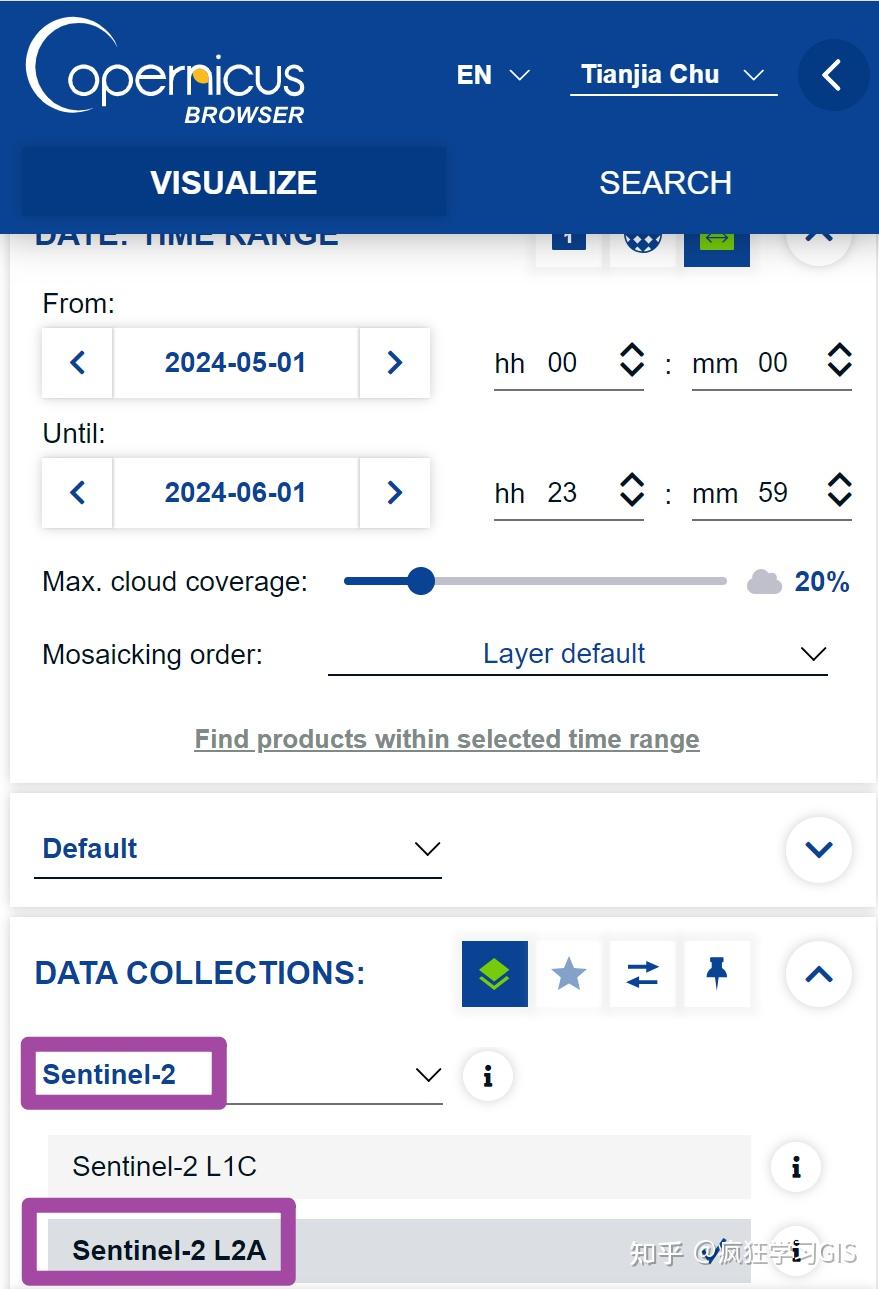 接下来,在左侧栏中按照我们的需求,调整所需下载数据的成像时间、卫星类型、数据级别、云量等信息。其中,因为我们需要下载Sentinel-2的2级产品,因此就选中“Sentinel-2 L2A”这一卫星,表示我们将要下载L2A级的Sentinel-2数据产品;如下图所示。此外,在右侧的地图中,首先在最右侧的工具栏中选中对应工具,则可通过鼠标绘制感兴趣区,作为下载遥感影像的地区。