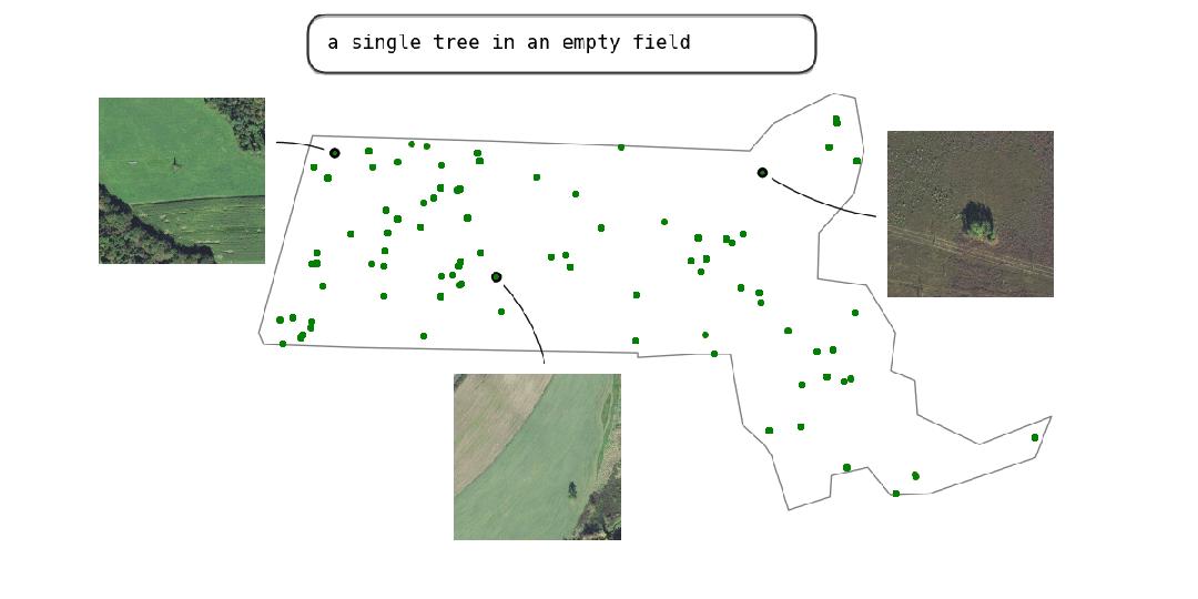将这种方法大规模应用于大面积地理区域时,最能体现其强大的功能和实用性。下面的可视化图展示了这种方法在整个马萨诸塞州的 NAIP 图像中的应用。我们可以看到,即使是 “空地上的一棵树 ”这样复杂的查询,我们也能获得极佳的匹配结果。