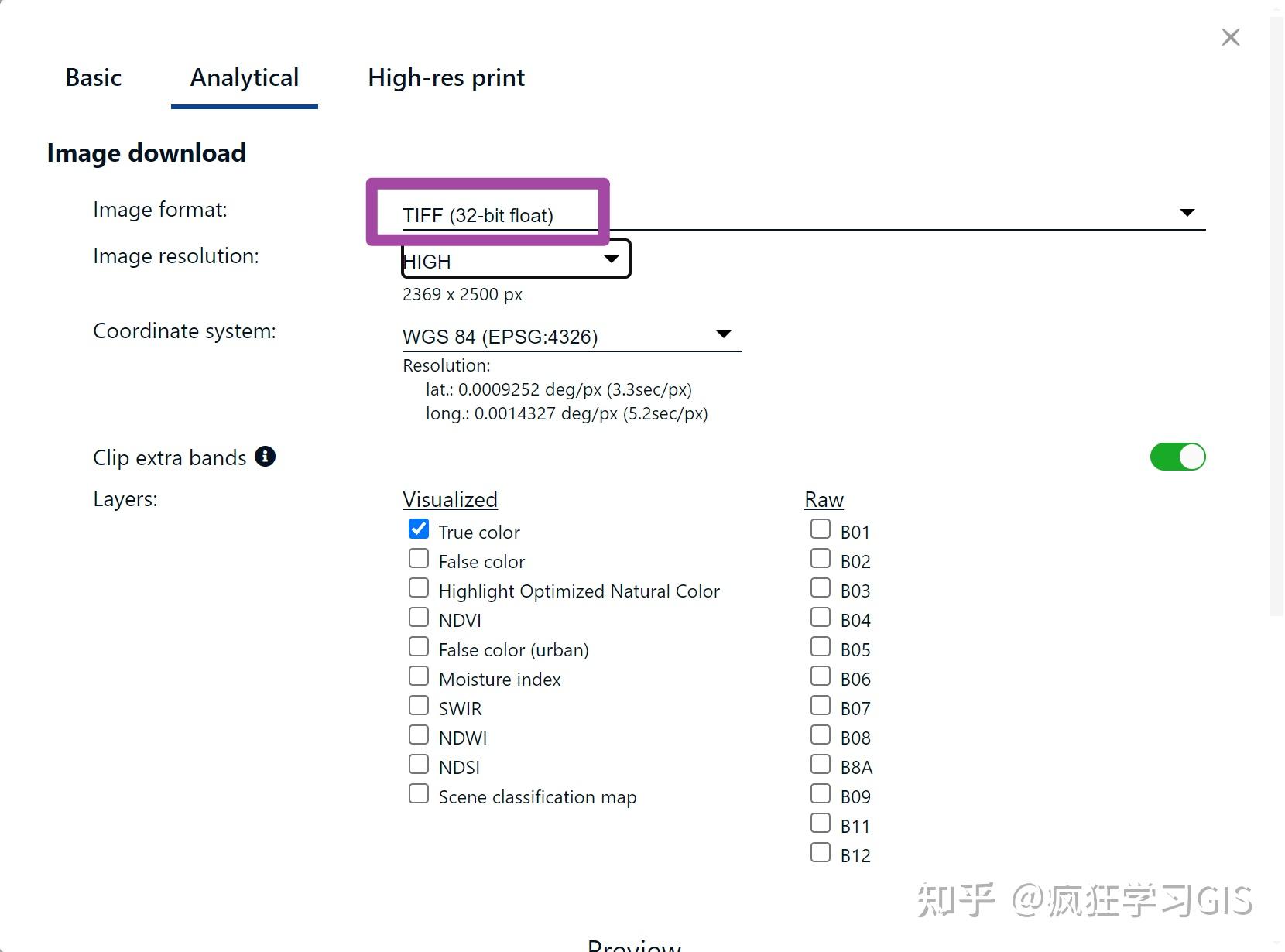 随后,在弹出的窗口中,选中“Analytical”,并将“Image format”选择为TIFF格式;如果不这么选择的话,下载下来的图片默认就是JPG这样的图片。