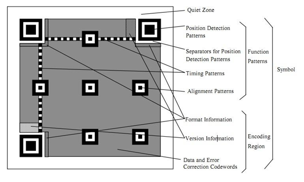 • Position Detection Pattern是定位图案,用于标记二维码的矩形大小。这三个定位图案有白边叫Separators for Postion Detection Patterns。之所以三个而不是四个意思就是三个就可以标识一个矩形了。