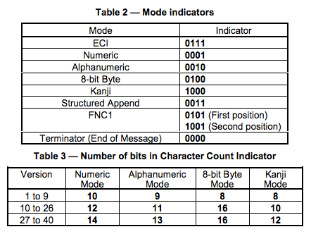 Numeric mode 数字编码,从0到9。如果需要编码的数字的个数不是3的倍数,那么,最后剩下的1或2位数会被转成4或7bits,则其它的每3位数字会被编成 10,12,14bits,编成多长还要看二维码的尺寸(下面有一个表Table 3说明了这点)