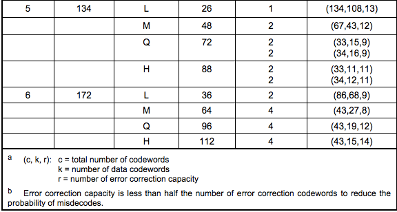 • Table 3 表示了,不同版本(尺寸)的二维码,对于,数字,字符,字节和Kanji模式下,对于单个编码的2进制的位数。(在二维码的规格说明书中,有各种各样的编码规范表,后面还会提到)