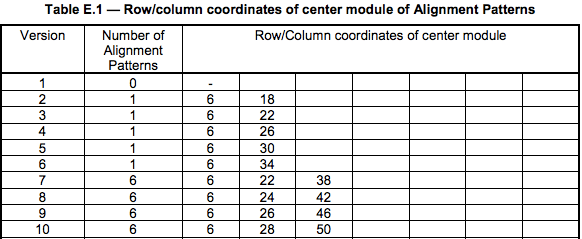 关于Alignment的位置,可以查看QR Code Spec的第81页的Table-E.1的定义表(下表是不完全表格)