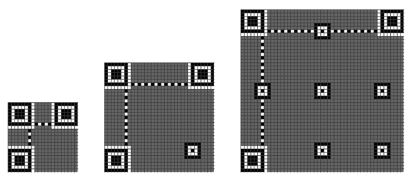 首先,我们先说一下二维码一共有40个尺寸。官方叫版本Version。Version 1是21 x 21的矩阵,Version 2是 25 x 25的矩阵,Version 3是29的尺寸,每增加一个version,就会增加4的尺寸,公式是:(V-1)*4 + 21(V是版本号) 最高Version 40,(40-1)*4+21 = 177,所以最高是177 x 177 的正方形。