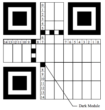 Format Information是一个15个bits的信息,每一个bit的位置如下图所示:(注意图中的Dark Module,那是永远出现的)