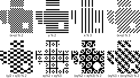 这样图就填好了,但是,也许那些点并不均衡,如果出现大面积的空白或黑块,会告诉我们扫描识别的困难。所以,我们还要做Masking操作,QR的Spec中说了,QR有8个Mask你可以使用,如下所示:其中,各个mask的公式在各个图下面。所谓mask,说白了,就是和上面生成的图做XOR操作。Mask只会和数据区进行XOR,不会影响功能区。