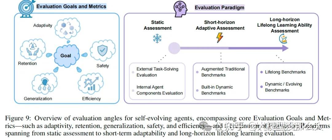 评估自进化智能体带来了一系列独特的挑战,这些挑战超出了对静态人工智能系统的传统评估范畴。与通常在固定任务集上于单一时间点进行评估的传统智能体不同,自进化智能体旨在通过与动态环境的持续交互来不断学习、适应和改进。因此,对它们的评估不仅需要捕捉即时的任务成功率,还必须涵盖其他关键方面,例如随时间推移的适应能力、知识的积累与保留、长期泛化能力,以及将在顺序或全新任务中习得的技能进行迁移的能力,同时还要减轻灾难性遗忘的影响。这就要求我们必须从根本上从传统的“一次性”评估模式,转向对其成长轨迹的纵向审视。