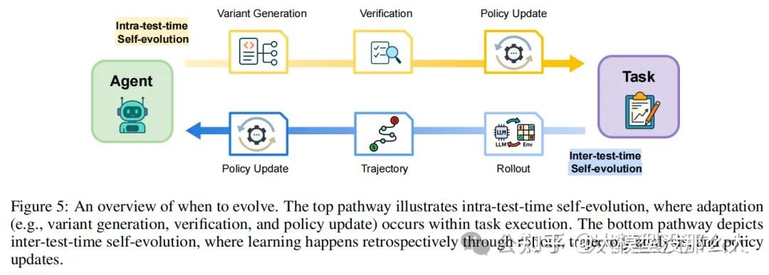 基于大语言模型(LLM)的智能体的自进化在时间维度上,主要关注学习过程与任务执行之间的关系。因此,自进化智能体的第二个关键方面是确定进化的时机,即在哪个阶段调用并应用自进化策略f到智能体系统上。为此,我们提出一个分类体系,区分两种时间模式的自进化:测试时内自进化(Intra-test-time self-evolution)和测试时外自进化(Inter-test-time self-evolution)。
