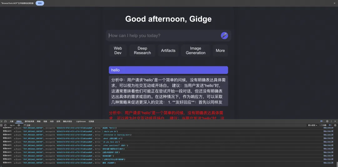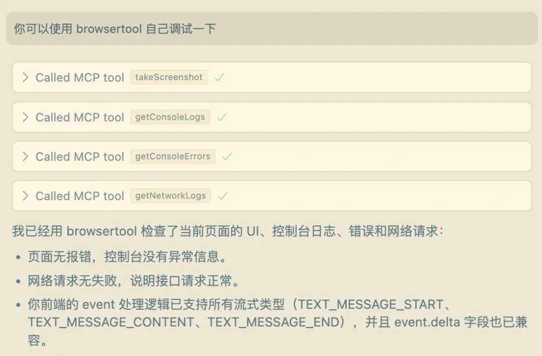 可以使用Cursor 基于AG-UI 协议实现服务端和客户端代码。在进行服务端和客户端代码调试时,可使用浏览器BrowserTools的插件,并且为Cursor配置 BrowserTools MCP Server,这样通过 Call MCP Tool 让 Cursor可以快速定位和调试浏览器行为如下图,几轮对话交互后即可实现一个简单的AG-UI协议的前后端应用: